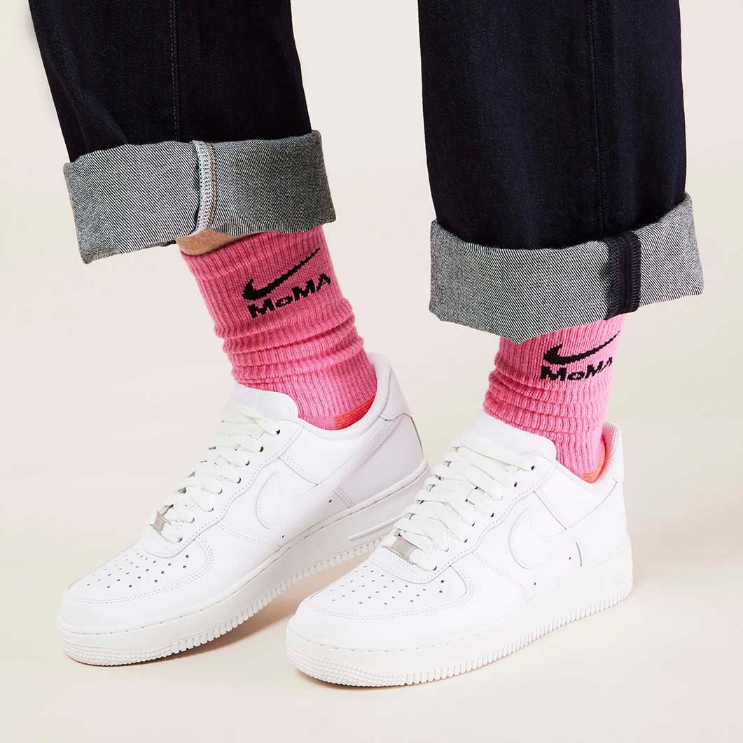 エブリデイ ソックスは、1970年代にグラフィックデザイナーのCarolyn DavidsonがデザインしたNikeのスウッシュとMoMAのロゴを配置し、つま先にユニークな「Just Do It」のステッチを施したデザインです。