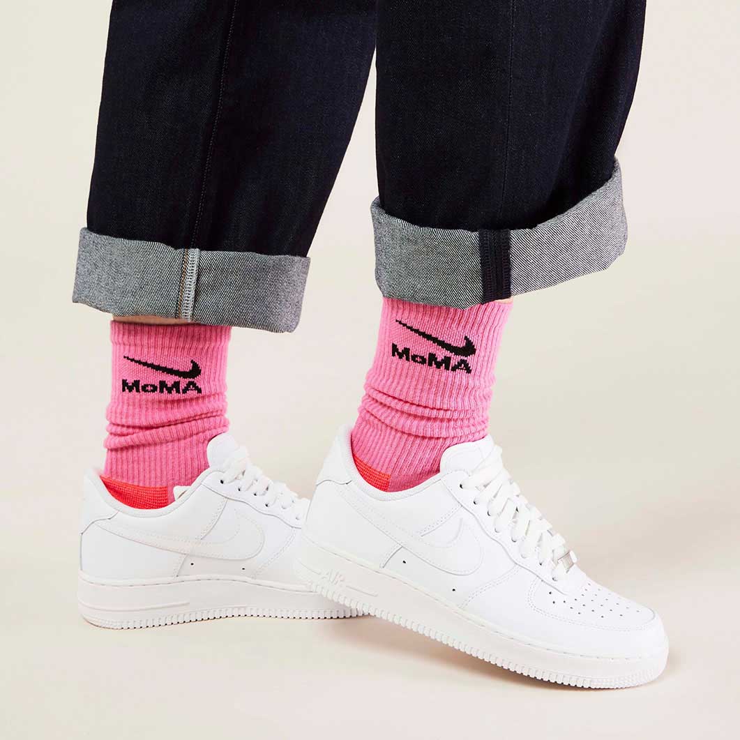 エブリデイ ソックスは、1970年代にグラフィックデザイナーのCarolyn DavidsonがデザインしたNikeのスウッシュとMoMAのロゴを配置し、つま先にユニークな「Just Do It」のステッチを施したデザインです。