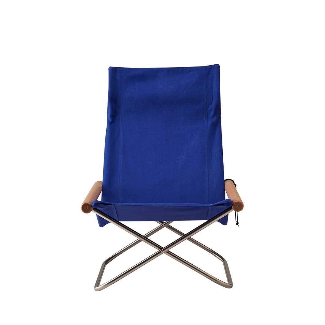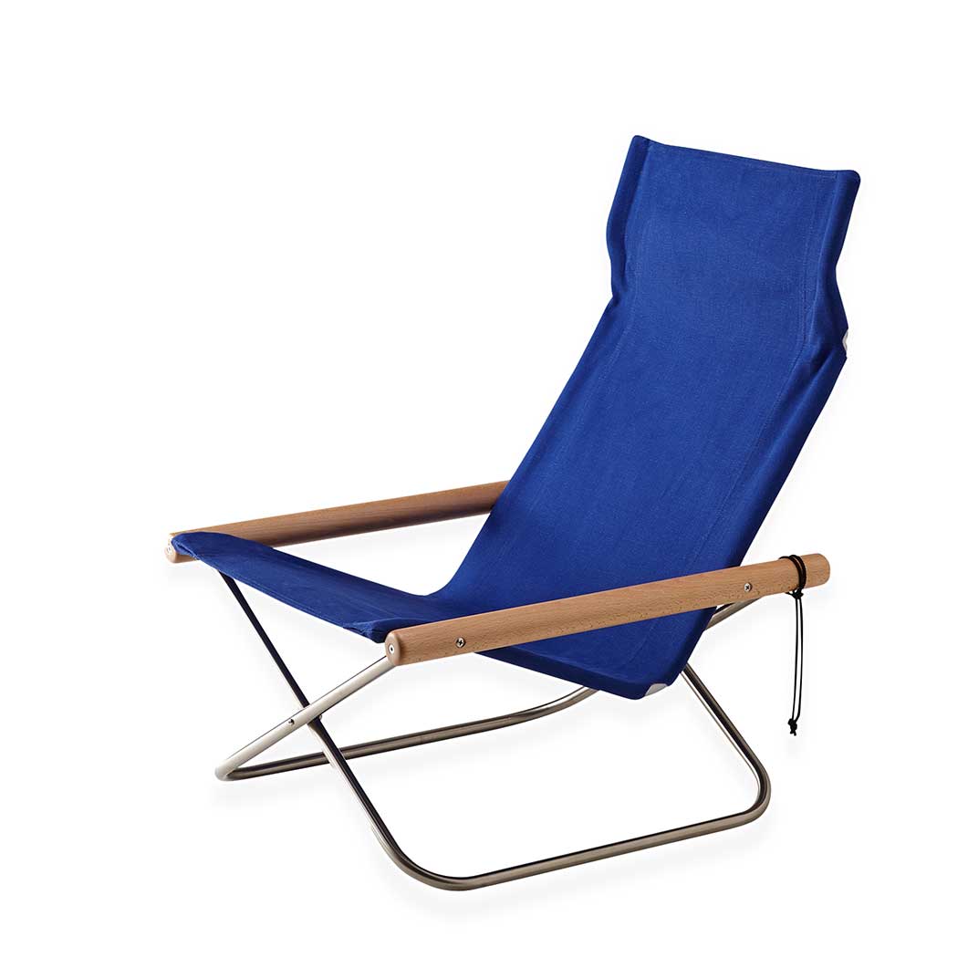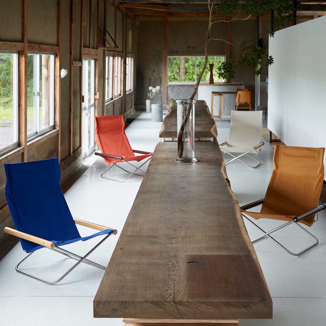 デザイナーである新居 猛は1950年代から折り畳み椅子づくりをはじめ、試行錯誤の末にたどり着いたのが、脚部のX構造でした。さらに木製の肘かけ、シートには綿の厚織生地を採用。すべてが相まって、快適な座り心地を実現しています。ニーチェアエックスは、その後に続く「ニーチェアエックスシリーズ」の原点であり、生涯折り畳み椅子の開発に取り組んだ新居 猛の集大成といえる製品です。