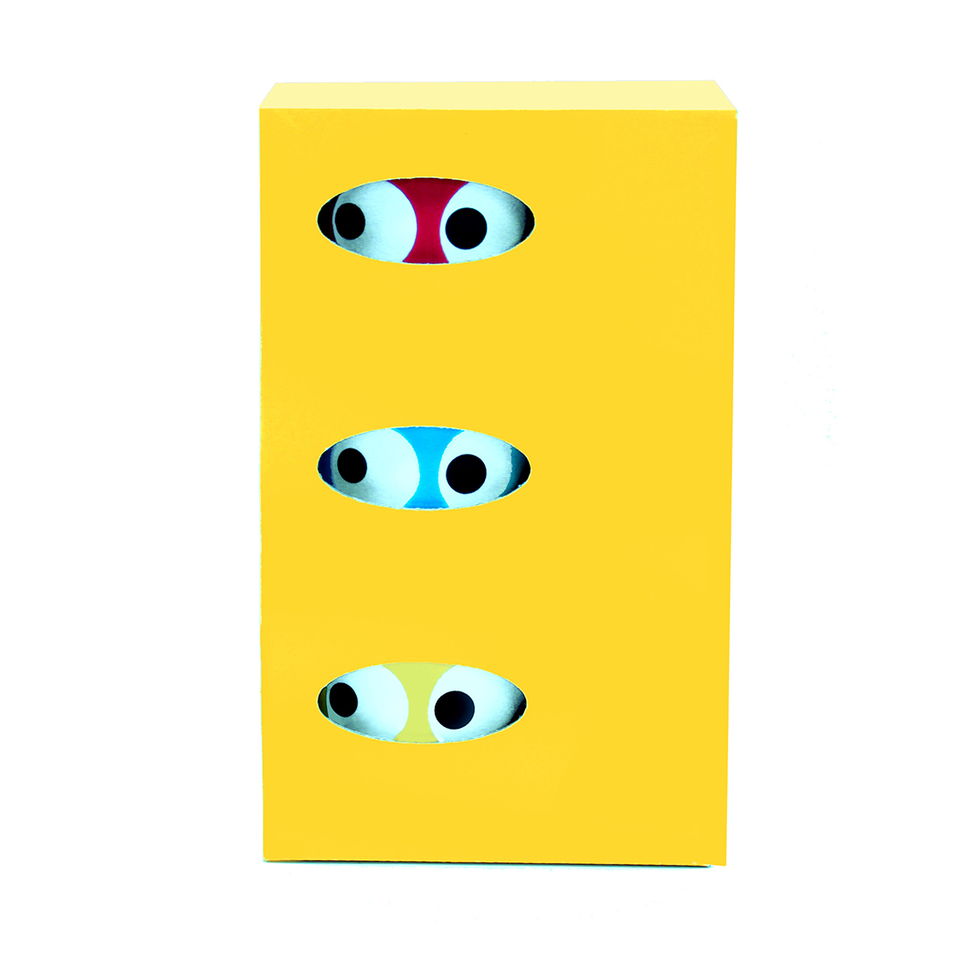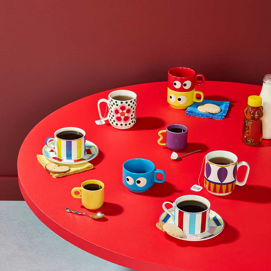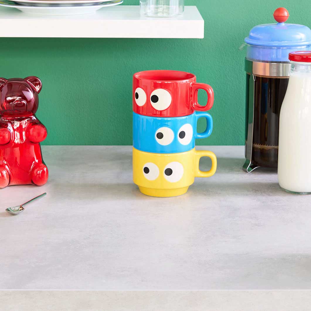 日本製のストーンウェアで作られたイエロー、ブルー、レッドのマグには、それぞれ大きな見張るような目がプリントされています。お気に入りの温かい飲み物を出すのに楽しく、キッチンカウンターのアクセントにもなります。積み重ねて収納できるので場所も取りません。