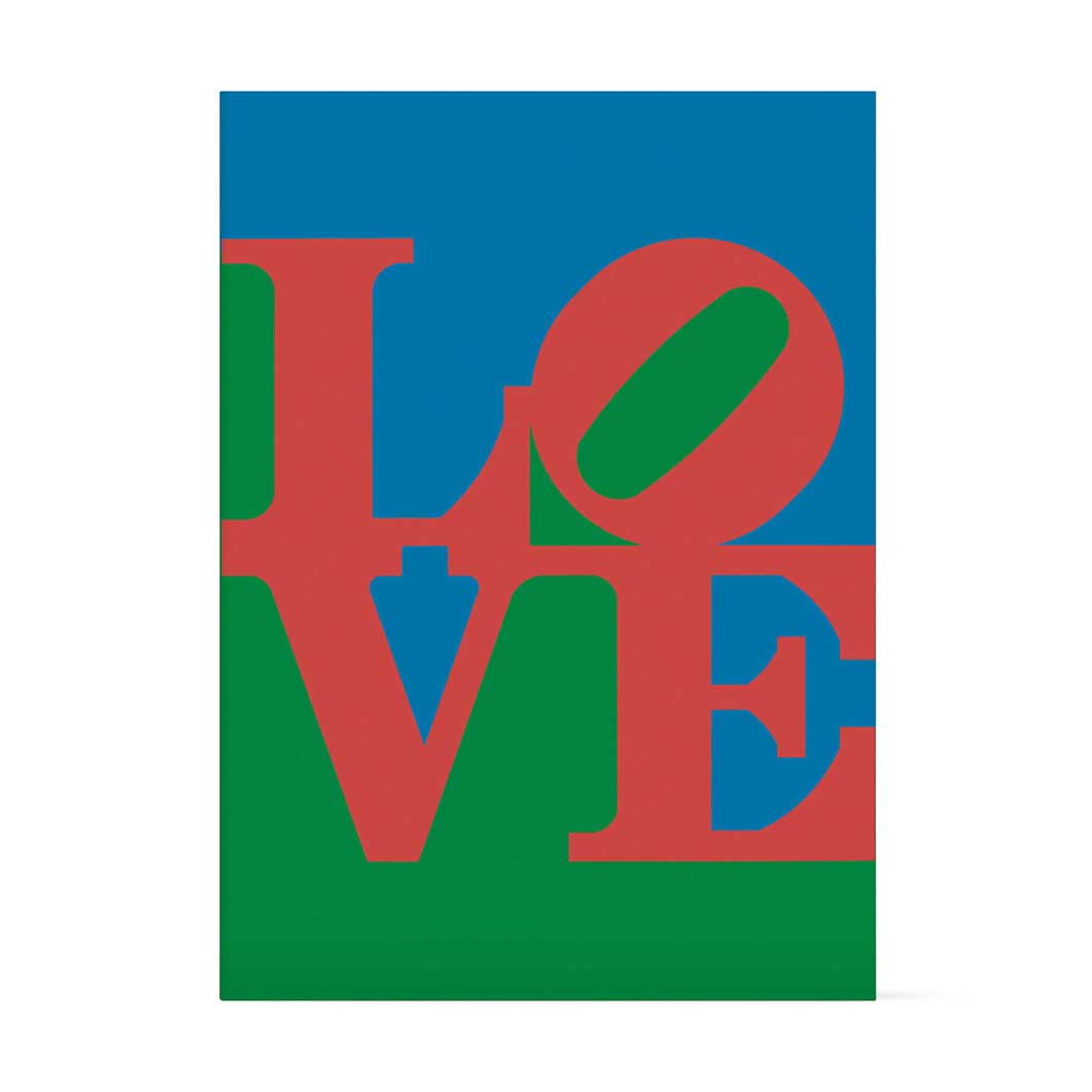 その後、1965年にインディアナはニューヨーク近代美術館(MoMA)から年末のホリデーカード用の作品提案を依頼され、《LOVE》を取り入れた12インチ四方の油彩キャンバス作品をいくつか提出しました。美術館は赤・青・緑の最も鮮やかな配色を選び、それはMoMAが販売したカードの中でも特に人気の高いものになりました。