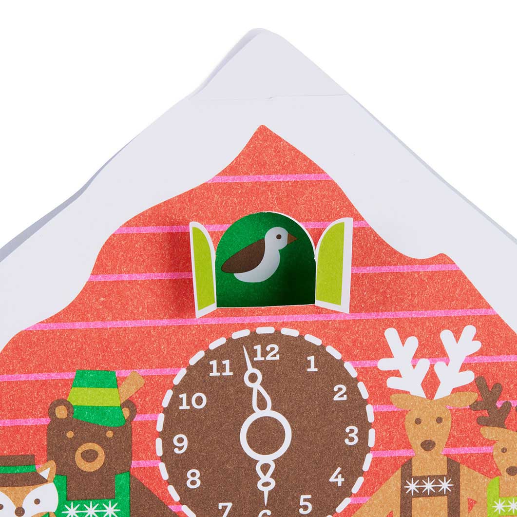 カッコー時計の扉が開くと、小鳥が顔を出します。デザインや設計はデザイナーの手作りで、組み立てもひとつひとつ丁寧に手作業で仕上げているので、単なるグリーティングカードというより、ちょっとしたオブジェのように楽しめます。