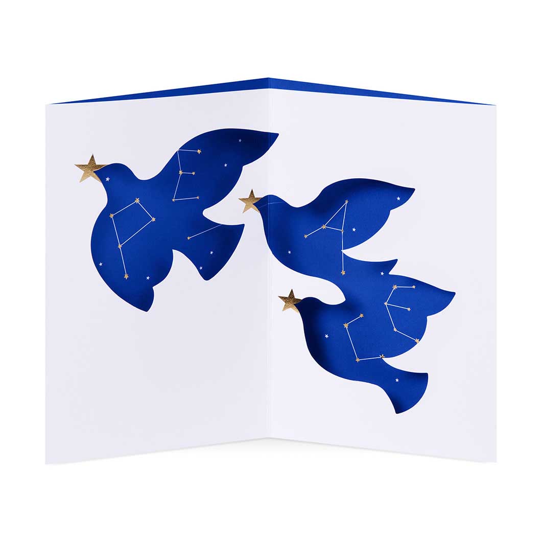 ダイカット加工のパーツとメタリックの装飾が施されています。デザインや設計はデザイナーの手作りで、組み立てもひとつひとつ丁寧に手作業で仕上げているので、単なるグリーティングカードというより、ちょっとしたオブジェのように楽しめます。各カードは筆記しやすい未コート紙に印刷されており、品質においてもしっかりとした質感と仕上がりを感じていただけます。
