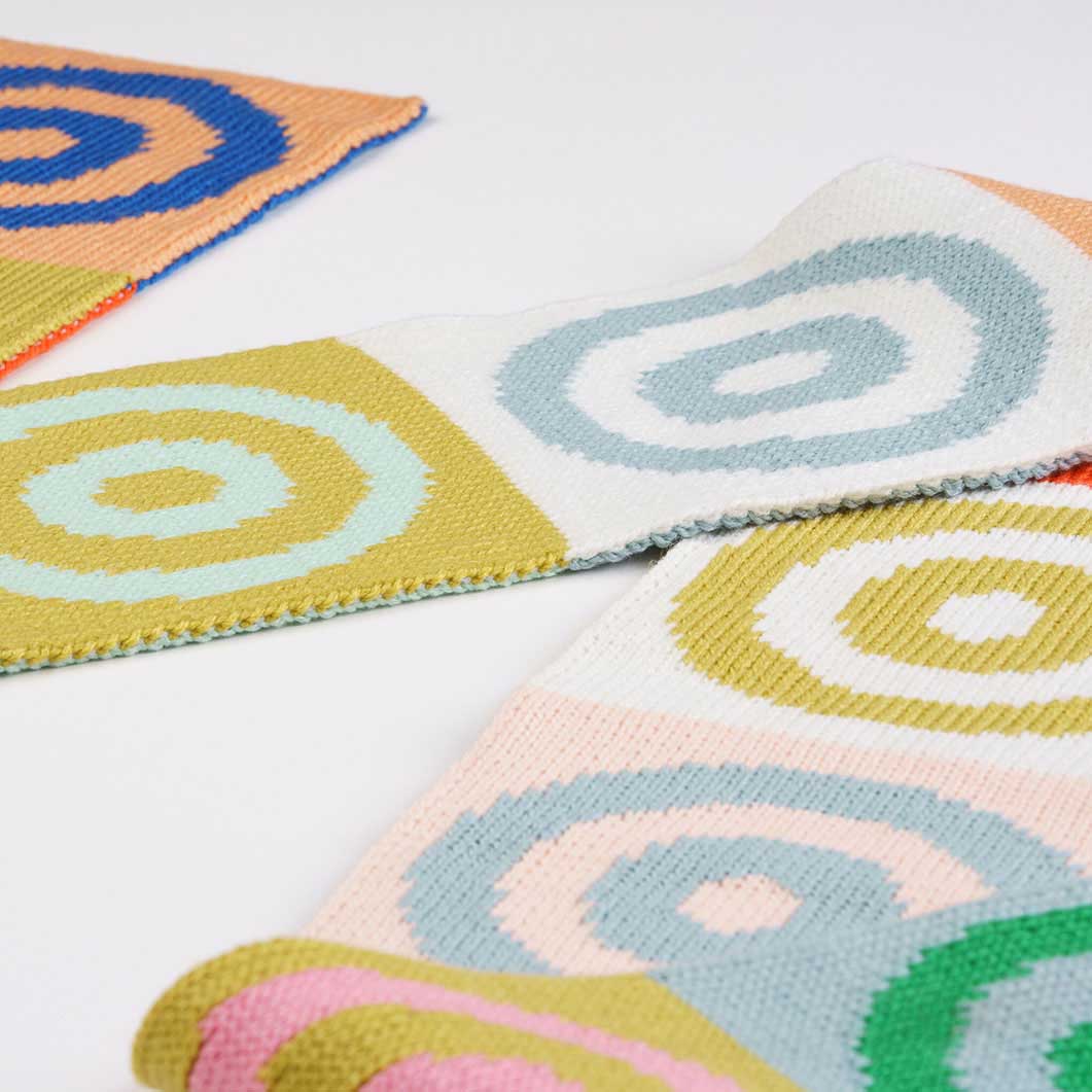ヴィンテージ風のデザインで、ジャガード編みの同心円ブロックをパッチワークのように配した柄が、コーディネートにも気分にも明るさをプラスしてくれます。気分やスタイルに合わせて、結んだり巻いたり自由にアレンジしてお使いください。