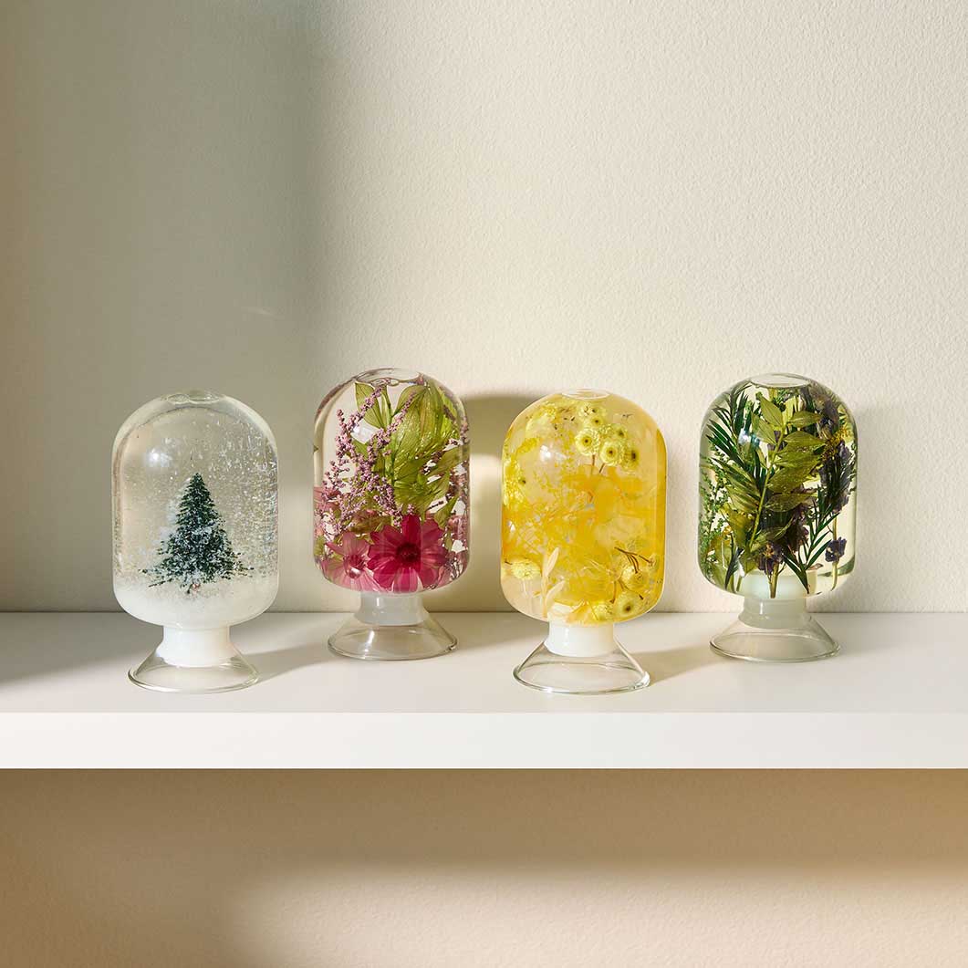 最盛期を捉えた花々を、手吹きガラスのドームに包み、保存液で満たしました。太陽の光を通して見ると、オブジェの中に穏やかな植物の森が広がっているように感じられます。