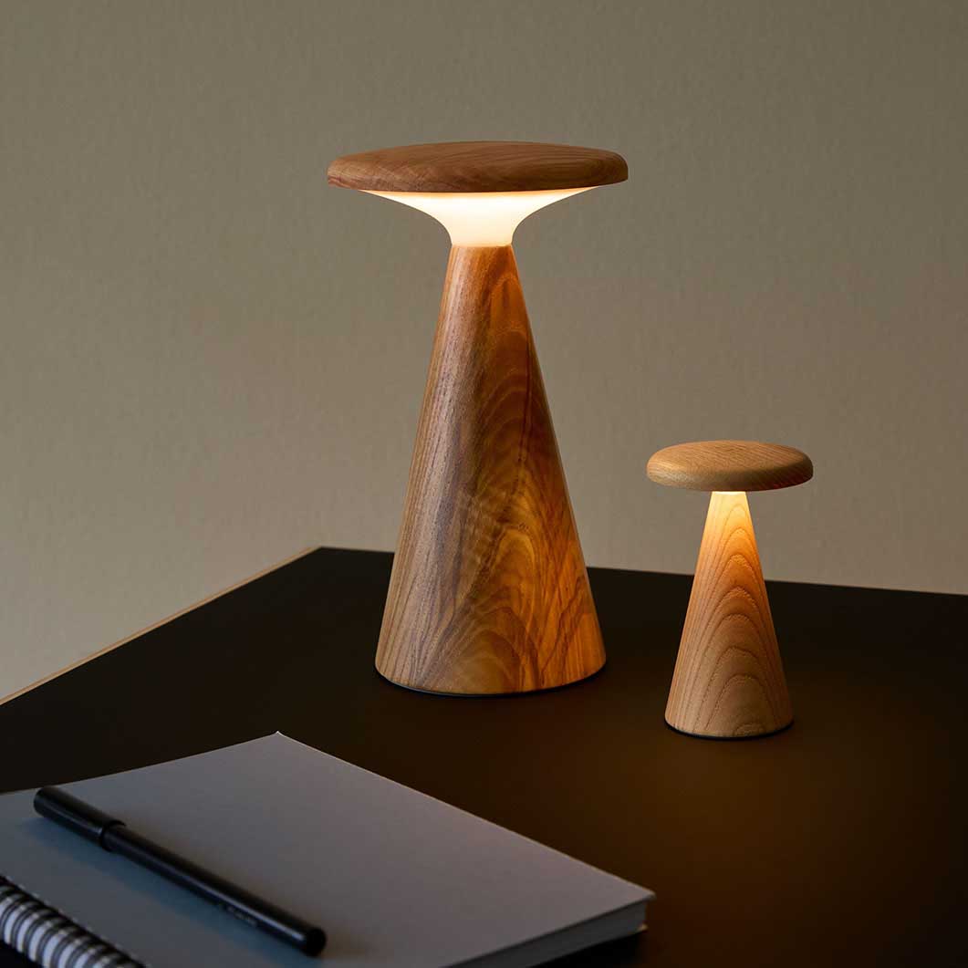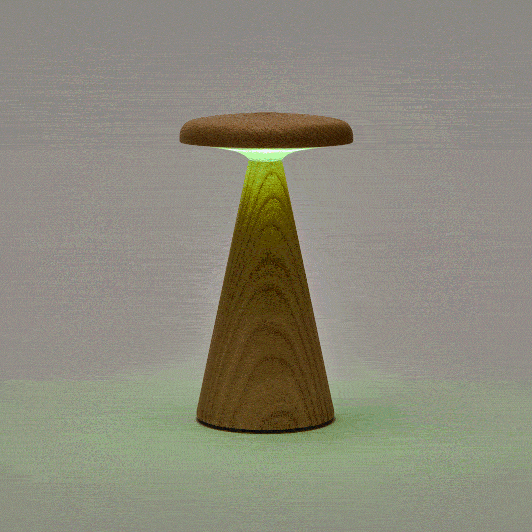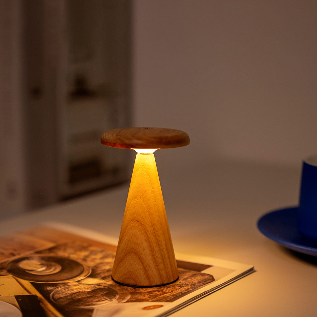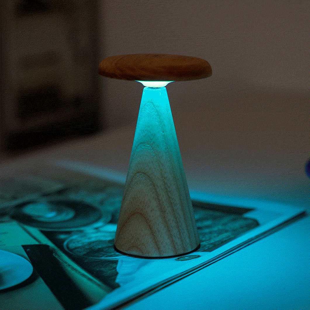 Sylva ポータブルランプは白アッシュ材のモダンなキノコ型シルエットと、落ち着いた間接光が特徴です。ランプの上部をタップすると暖かい白色光で点灯し、もう一度タップすると赤・青・オレンジ・黄・緑・紫・フクシアの7色を順に切り替えます。