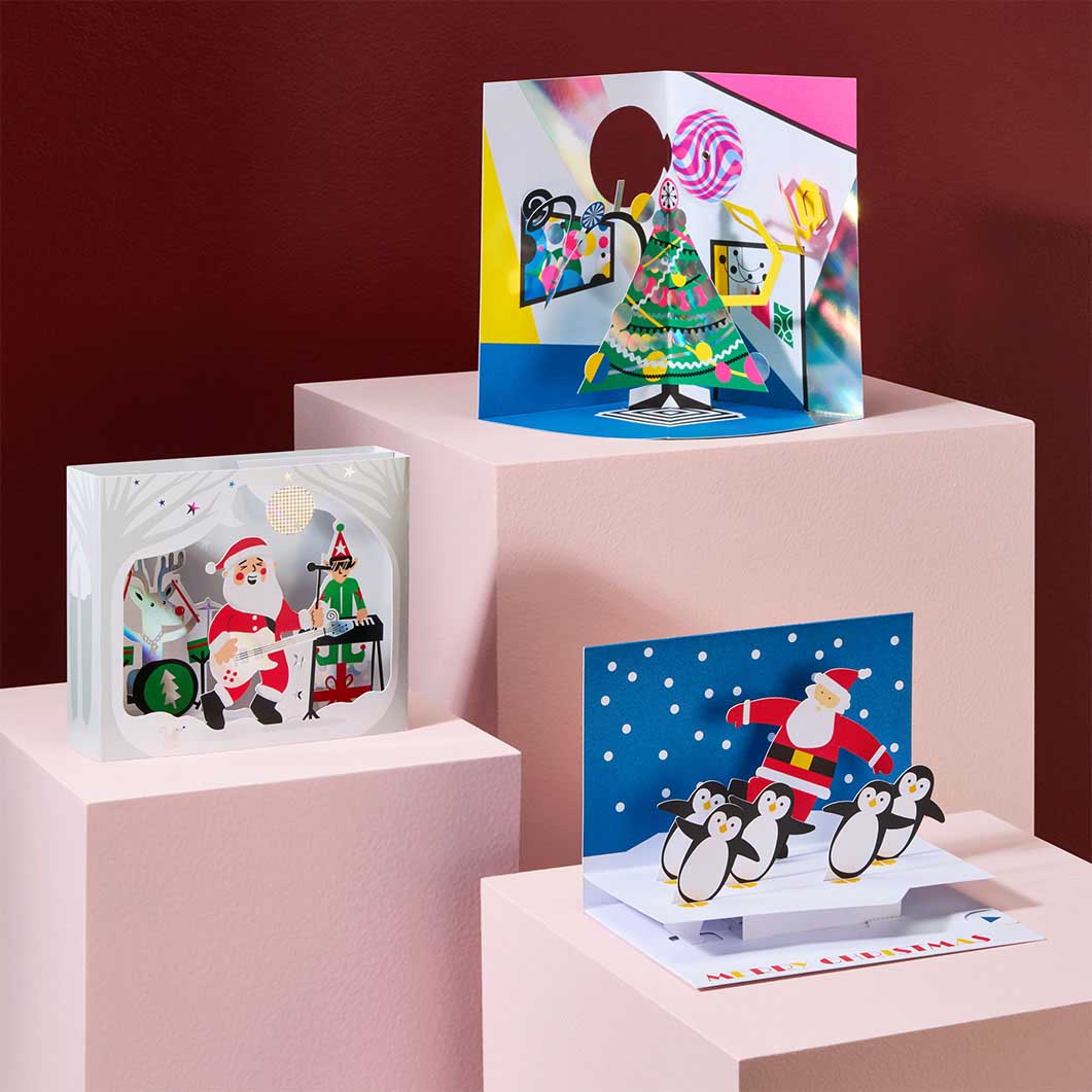 ポップアップの仕掛けはスライダー式で、スライドさせるとペンギンが動きます。デザインや設計はデザイナーの手作りで、組み立てもひとつひとつ丁寧に手作業で仕上げているので、単なるグリーティングカードというより、ちょっとしたオブジェのように楽しめます。