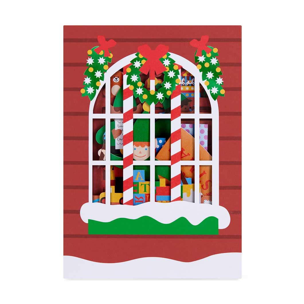 開くとサンタの工房で働くエルフが現れます。デザインや設計はデザイナーの手作りで、組み立てもひとつひとつ丁寧に手作業で仕上げているので、単なるグリーティングカードというより、ちょっとしたオブジェのように楽しめます。