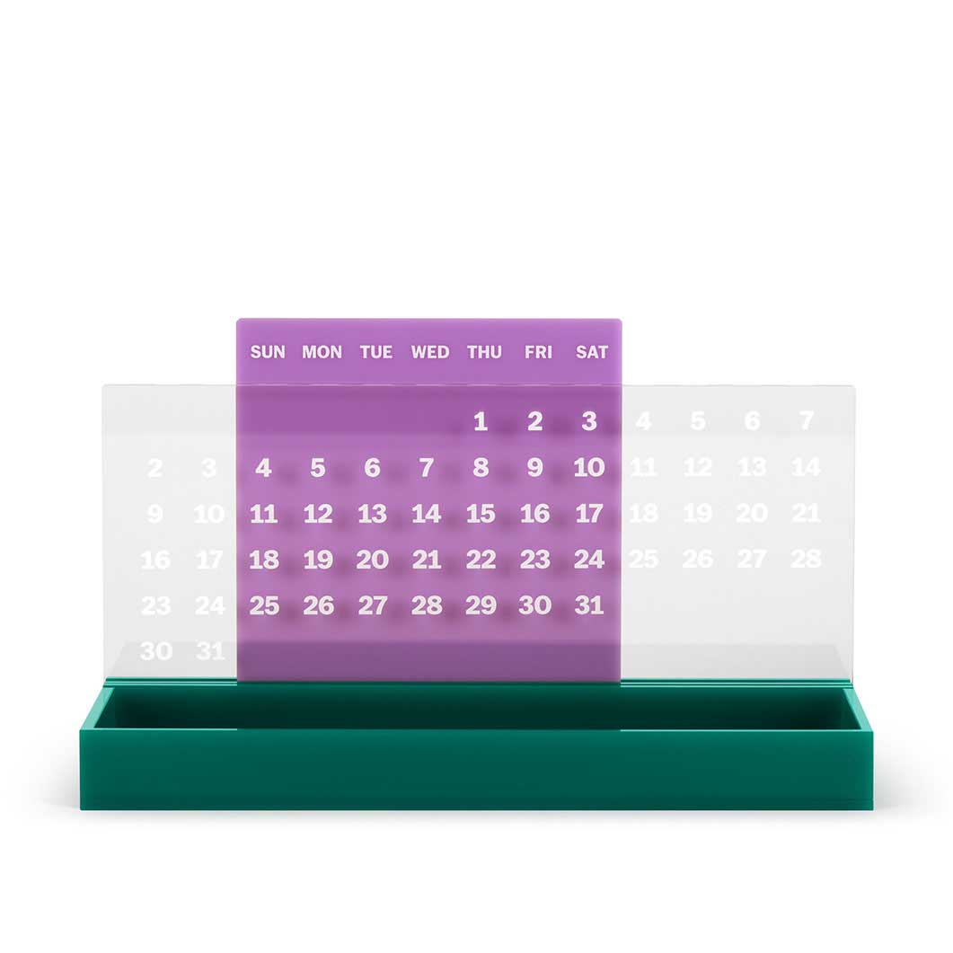 カラフルなアクリルシートを、日付と曜日の数字の後ろにスライドさせていくと、現在の月にぴったり合う配置をつくれます。さらに、コントラストの効いた色のアクリルで作られたオーガナイザートレイには、ペンやクリップ、ちょっとした小物をすぐ手に取れるようまとめておけます。