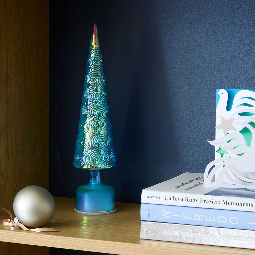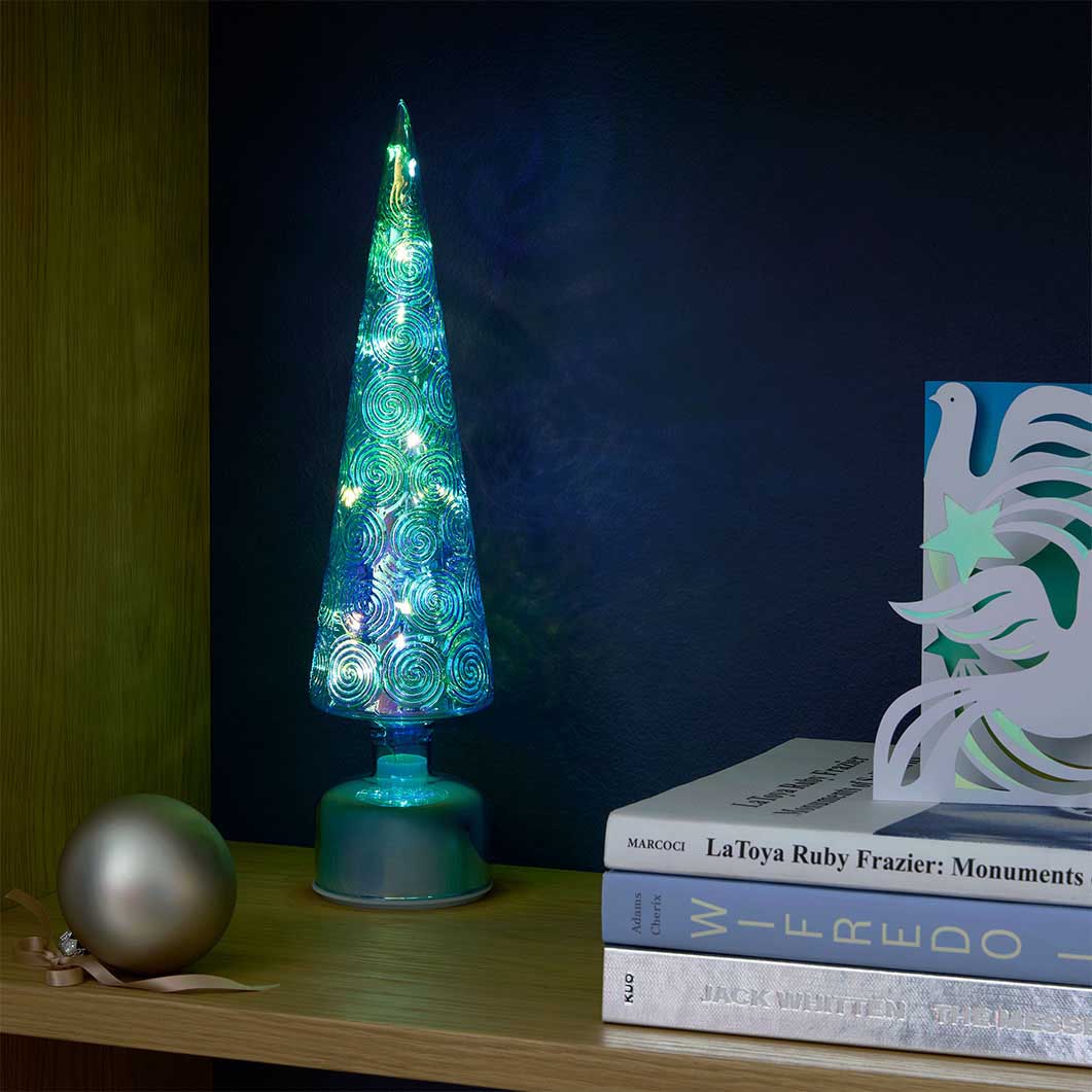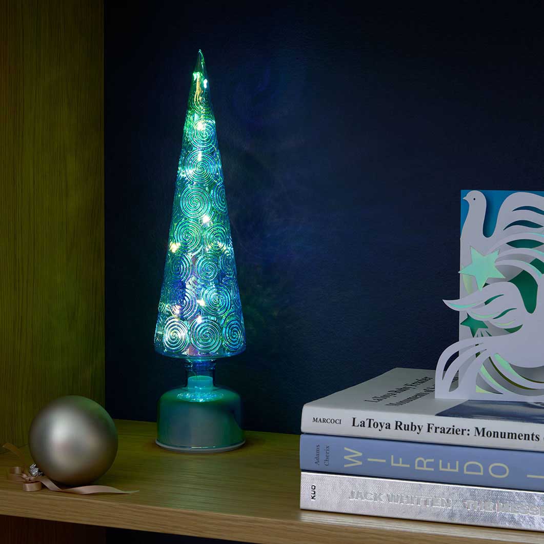 内部の暖色LEDライトが灯り、回転することで幻想的な輝きを放ちます。暗い部屋では、壁にカラフルな光のうねりを映し出し、まるでゴッホの名画が動き出したかのような効果を楽しめます。