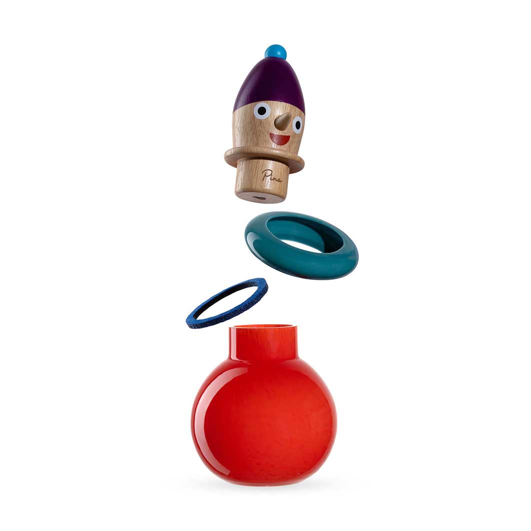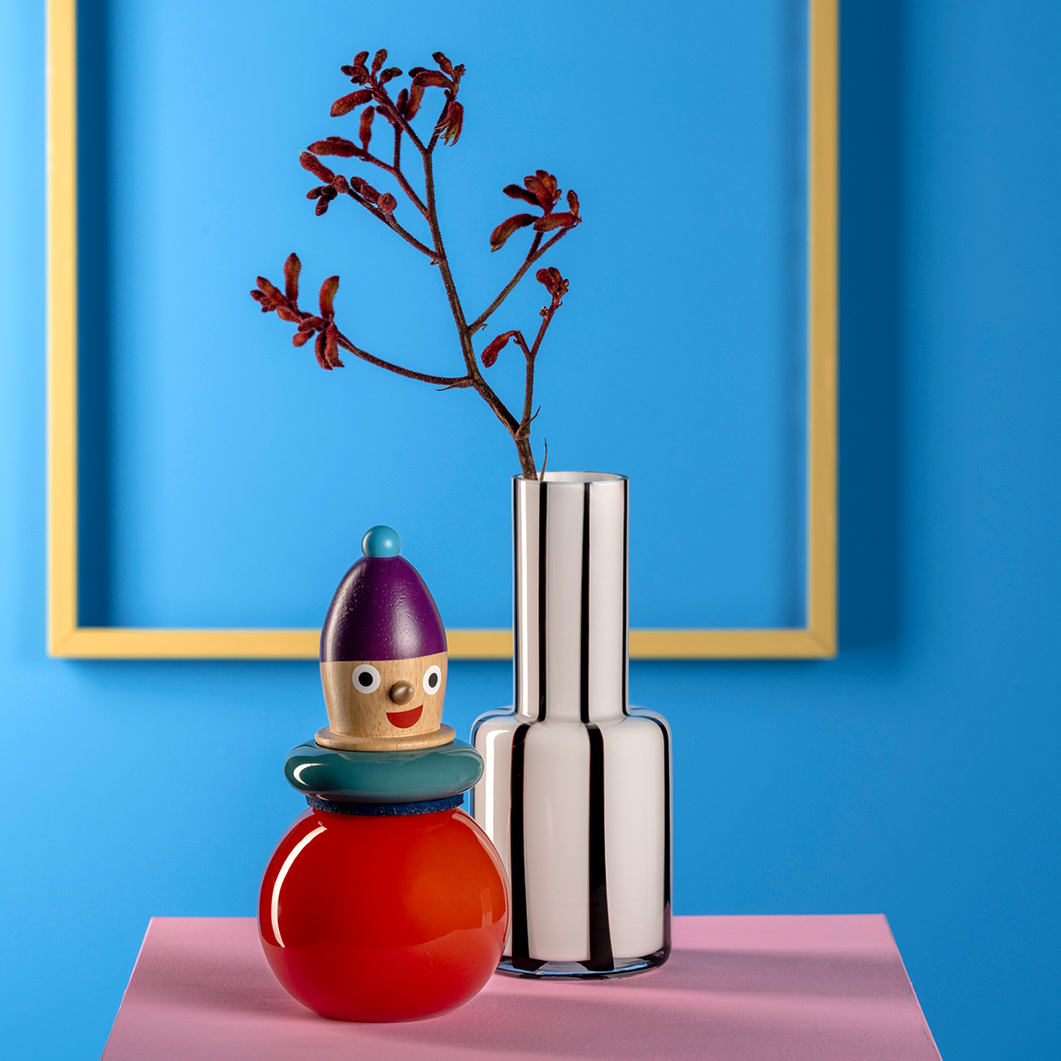 イタリアの典型的な人物像にインスピレーションを得ており気さくで陽気な雰囲気が部屋に漂います。耐久性の高い色付きソーダ石灰ガラスのほか、木、フェルト、セラミックを使って作られています。ベースの各パーツは取り外し可能で、自由に組み合わせることができ、2体または3体すべてを購入すると、パーツを入れ替えて楽しむことができます。