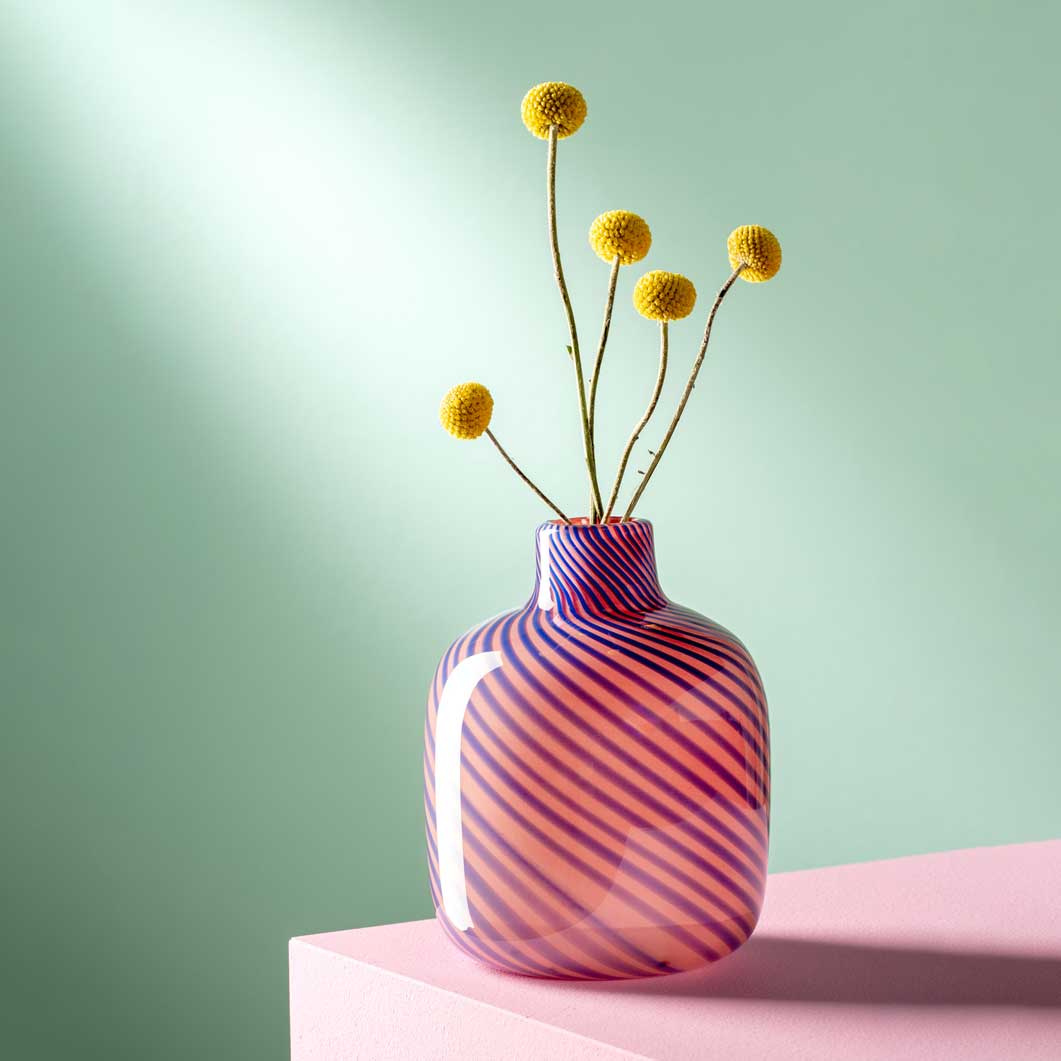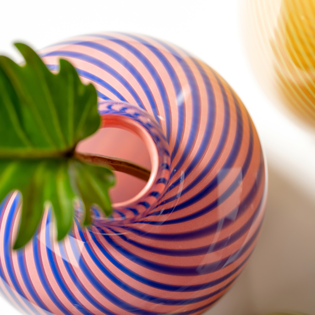 手吹きガラスを何層にも重ねて作られており、豊かな色彩の波状のラインが特徴。ドラマチックな花あしらいに使うのはもちろん、そのまま美しく鮮やかなオブジェとして飾っても映えます。