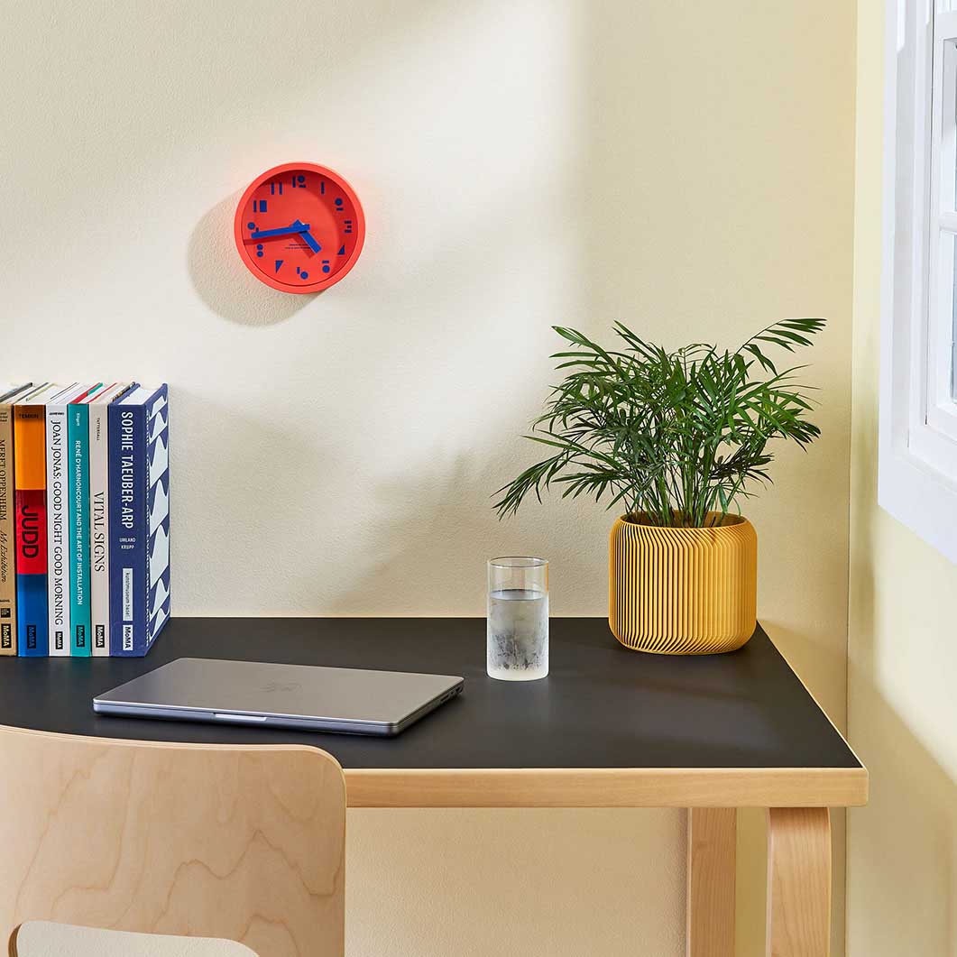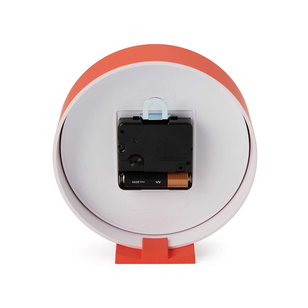 シンプルながらエレガントで遊び心もあり、アルミを切り取ったようなシリンダー形の本体に文字盤がやや上向きに傾いているため、幾何学的なテーマが際立ちます。針と文字盤には蓄光性のレジンがコーティングされており、暗い場所や薄暗い環境でも見やすく、ベッドサイドやキッチン、デスク、マントルピースなどにも置きやすいデザインです。
