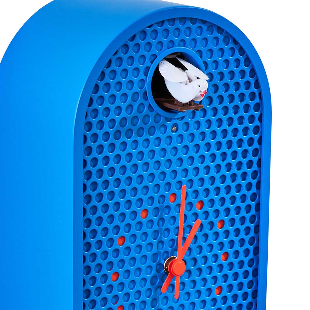 正面にはパンチングメタルを用いる事で、多数の孔がカッコーの大きな丸穴と合わせてグラフィカルかつ軽快な印象を与えます。また、時計の指標部分は孔の位置に合わせた箇所に色を付けた本体と一体感のある表現になっています。