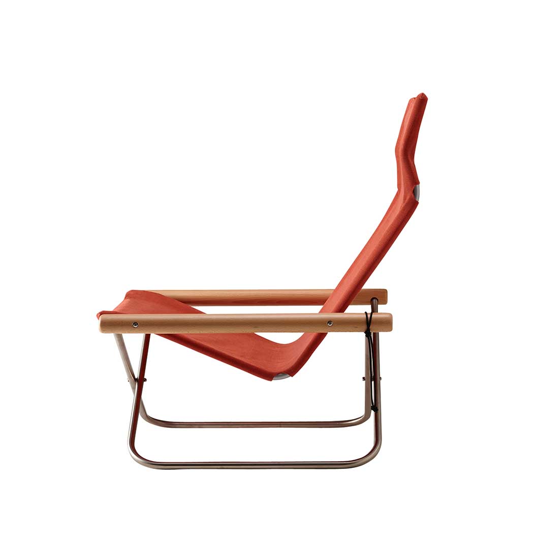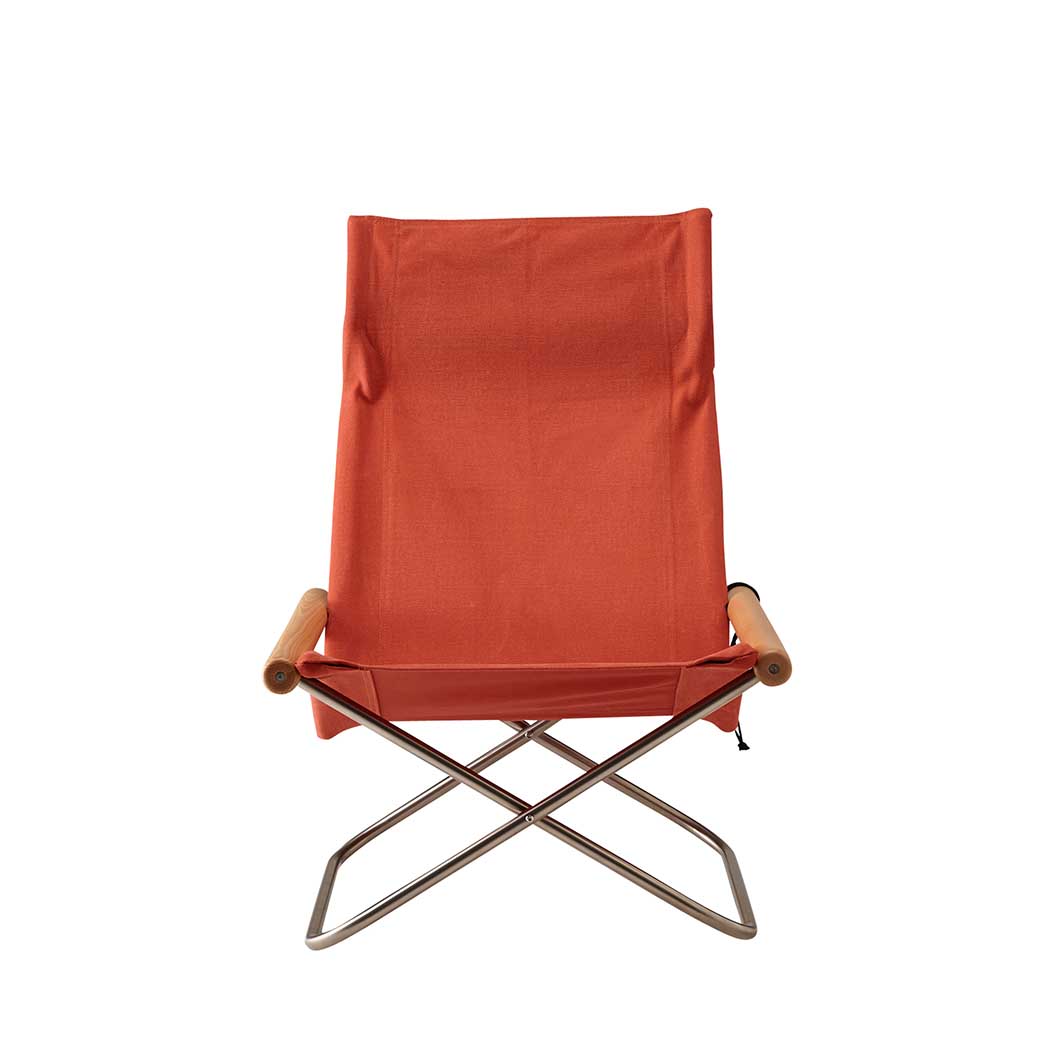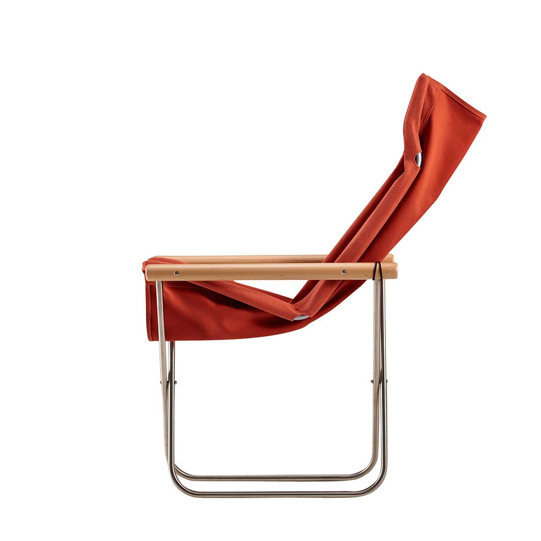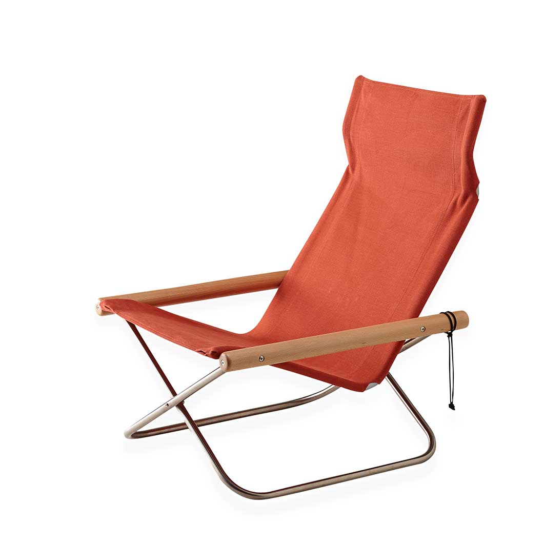 デザイナーである新居 猛は1950年代から折り畳み椅子づくりをはじめ、試行錯誤の末にたどり着いたのが、脚部のX構造でした。さらに木製の肘かけ、シートには綿の厚織生地を採用。すべてが相まって、快適な座り心地を実現しています。ニーチェアエックスは、その後に続く「ニーチェアエックスシリーズ」の原点であり、生涯折り畳み椅子の開発に取り組んだ新居 猛の集大成といえる製品です。