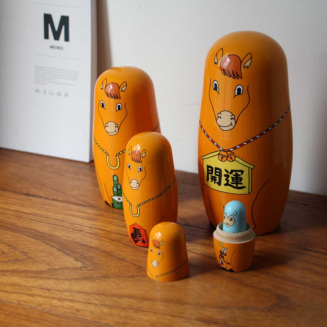 入子式になったユニークな馬たちが、ホースシュー、絵馬、左馬など縁起物を持って新年を祝ってくれます。最後には2027年の干支、羊が待機しています。