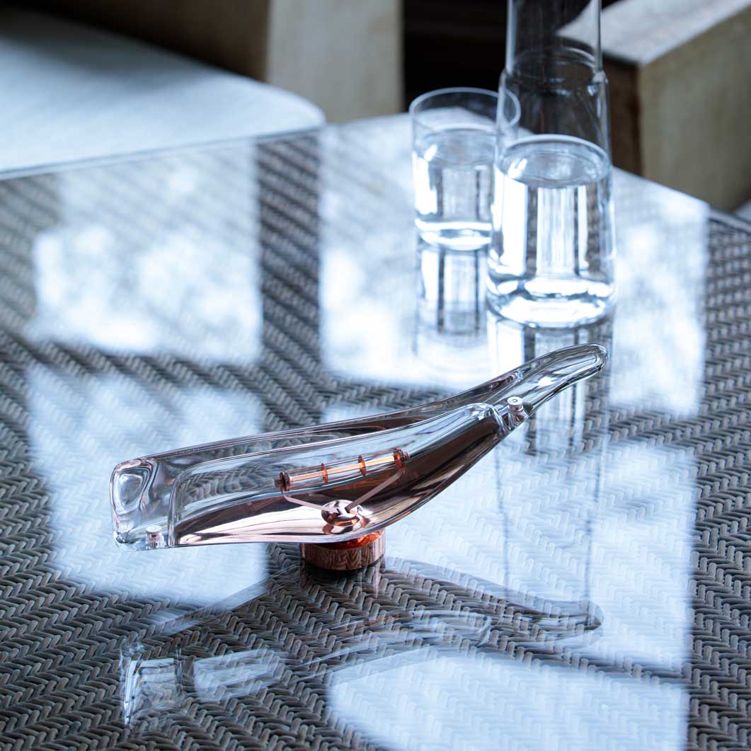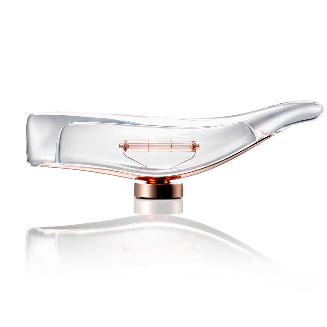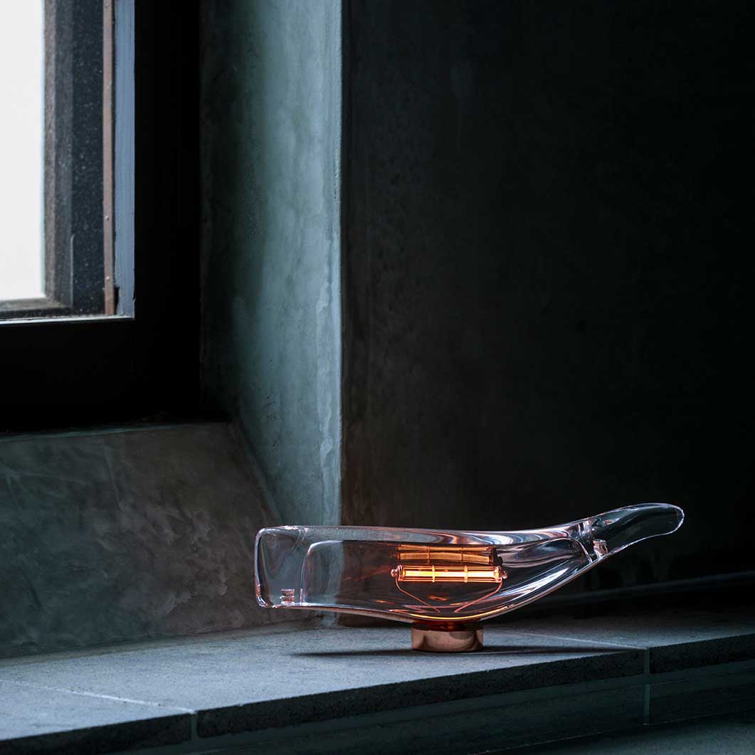 精密な金属加工によって作られた極めて繊細なディティールのフレームと調和し、象徴的な光となって空間に浮かび上がります。ベースは重厚感のある亜鉛ダイキャストの銅メッキ仕上げ、トップカバーは特殊な成形方法によるアクリル製。純度の高いアクリルこそが表現できる、クリスタルガラスのように透き通ったマッコウクジラの姿は、日中には明るい陽射しのもとで自然な輝きを放ち、そっと人々の日常に寄り添います。