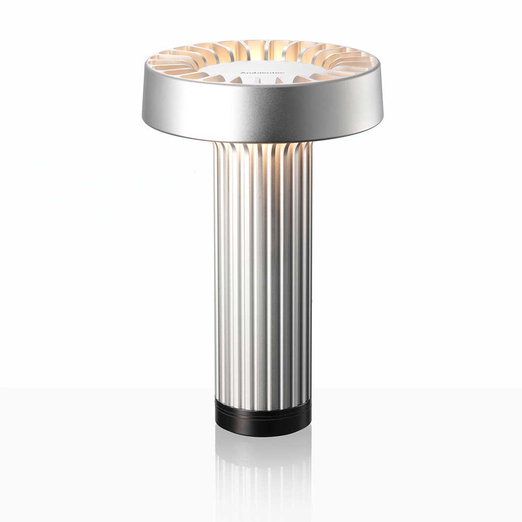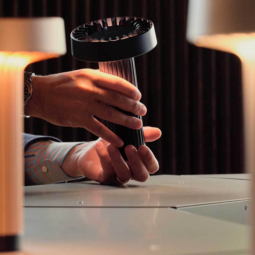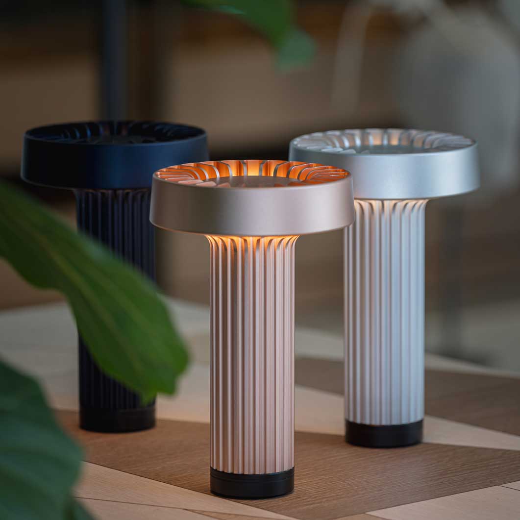 本体はアルミニウムの一体成型で内側と外側が表裏一体となった構造が特徴です。強度と放熱機能を保ちながらランプシェードとしても機能するユニークな設計。グリップの溝に美しいグラデーション描きながらテーブル上へ優しい光を落とします。