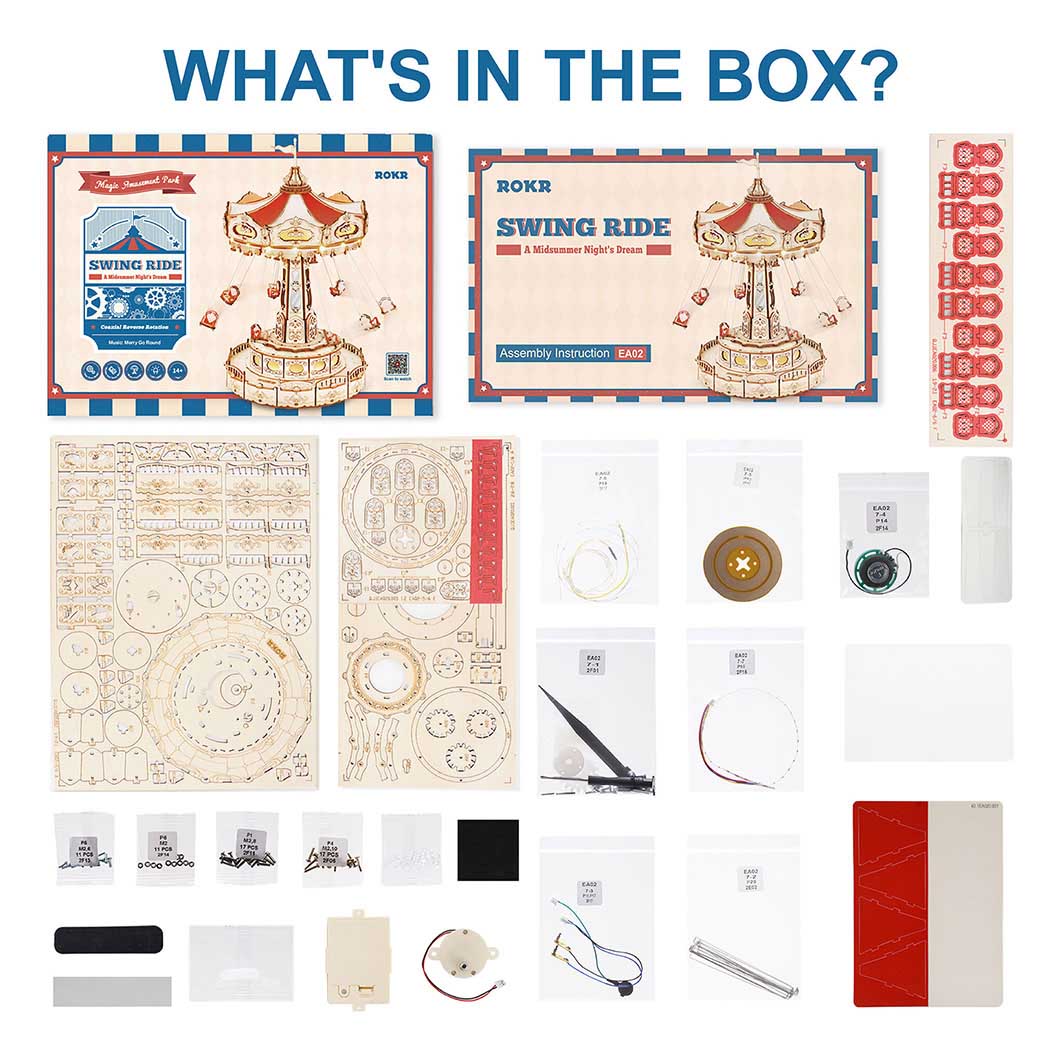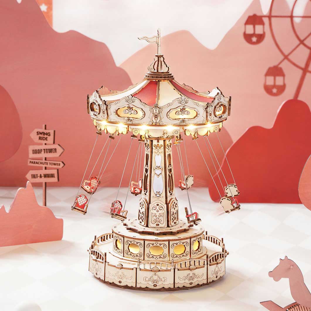 Rolifeのこの楽しい3Dキットで、小さなスイングライドミュージックボックスを組み立ててください。デザインはクラシックな遊園地のスイングライドに着想を得ており、回転する天井から吊り下がったシートが実際に動く仕組みになっています。さらに、土台のボタンを押すと動作に合わせて音楽が鳴り、ライトが点灯します。