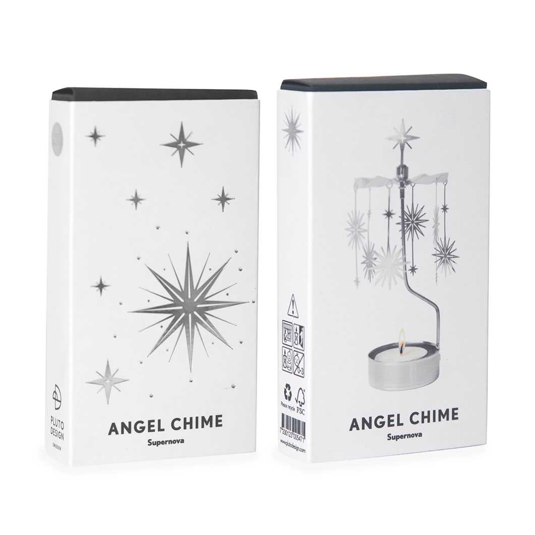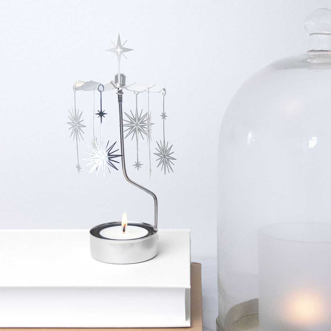 スタンドにティーライトキャンドルを灯すと、木をイメージしたモビールが温かい空気に乗ってゆっくり回転します。モビールには、星がはじけるようなモチーフが飾られ、光と影がきらきらと広がる魅力的なデザインです。