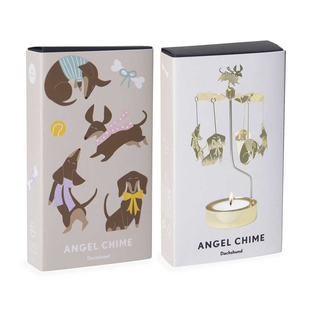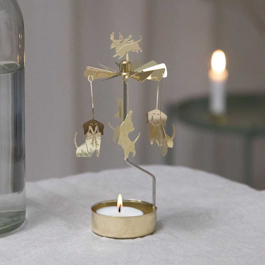 スタンドにティーライトキャンドルを灯すと、木を思わせるモビールが温かい空気に乗ってくるくると回転します。モビールにはさまざまなポーズのダックスフンドが飾られ、眺めているだけで心が和むデザインです。