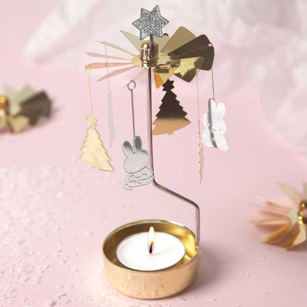 スタンドにティーライトキャンドルを灯すと、木をモチーフにしたモビールが、あたたかな空気に乗ってゆっくりと回転します。モビールにはクリスマスツリーやミッフィーの飾りがついていて、眺めているだけでホリデー気分を高めてくれます。