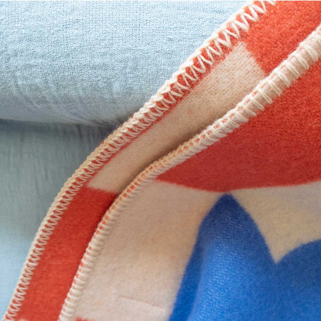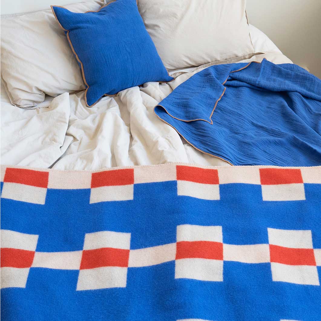 ストックホルムでデザインされ、リトアニアで丁寧に作られたこのブランケットは、伝統的なデザインに鮮やかなカラーを組み合わせ、赤・青・白のグラフィックパターンがベッドやソファに個性を添えてくれます。大きめサイズなのでベッドで体を包み込むのにも、ソファでテレビを見ながらくつろぐときのカバーにもぴったりです。