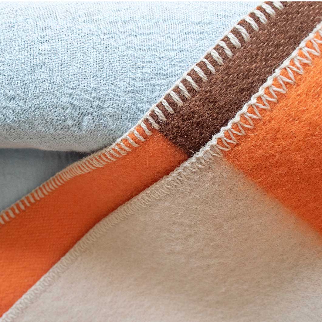 伝統的なデザインに鮮やかなオレンジ・ブラック・クリーム色を合わせたグラフィックパターンが、ベッドやソファにインパクトを与えます。ベッドで体をすっぽり包むのはもちろん、ソファでテレビを見ながらくつろぐときのカバーとしても十分なサイズです。