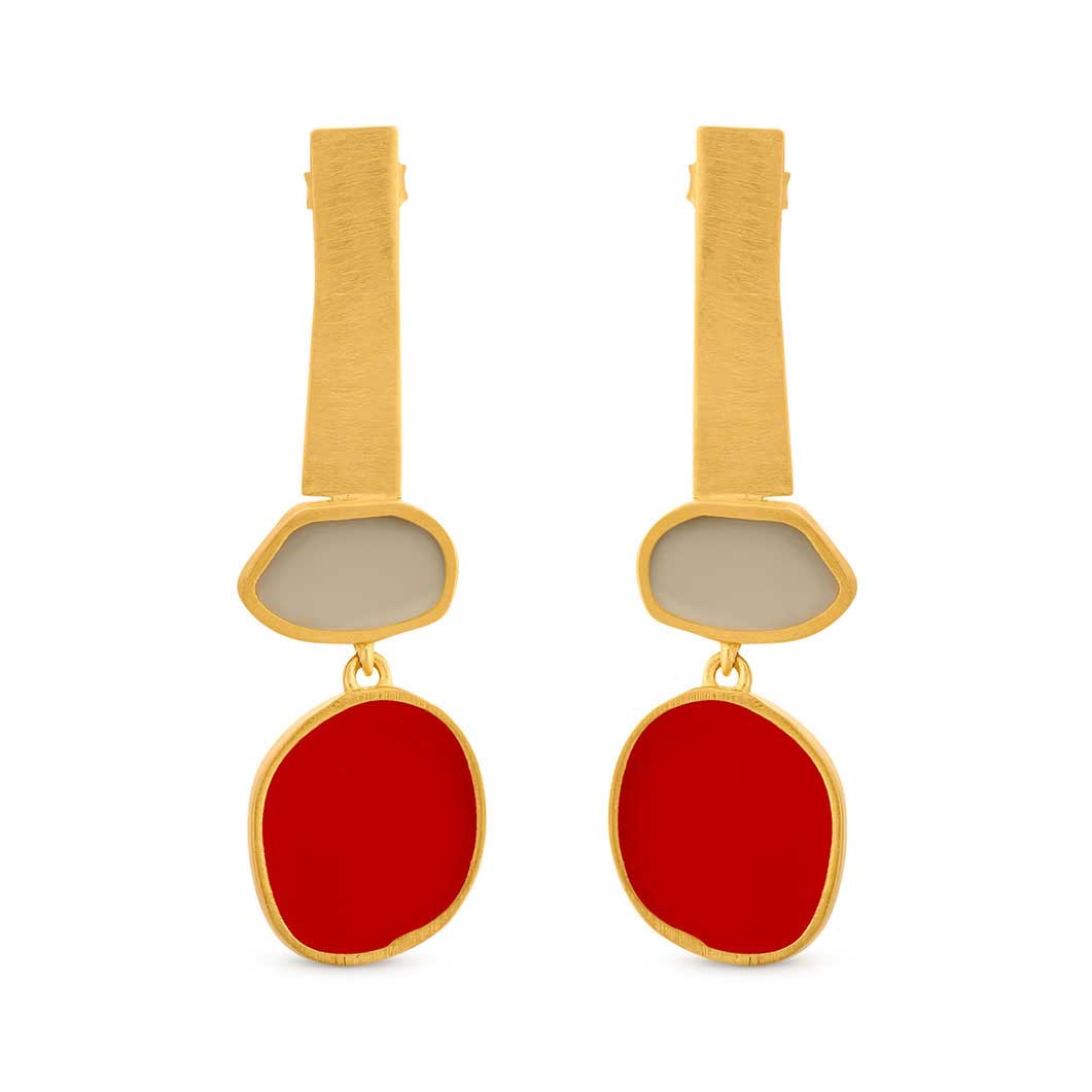 アーティストでありグラフィックデザイナーでもある、クリエイティブディレクターのCristina JuliàがGeometric Collageシリーズを考案しました。2つのピアスは24金メッキのマットメタルとカラードエナメルによる不揃いなシェイプが特徴です。単体でさりげないアクセントにすることも、コーディネートされたネックレスやリングと合わせてより印象的にすることもできます。