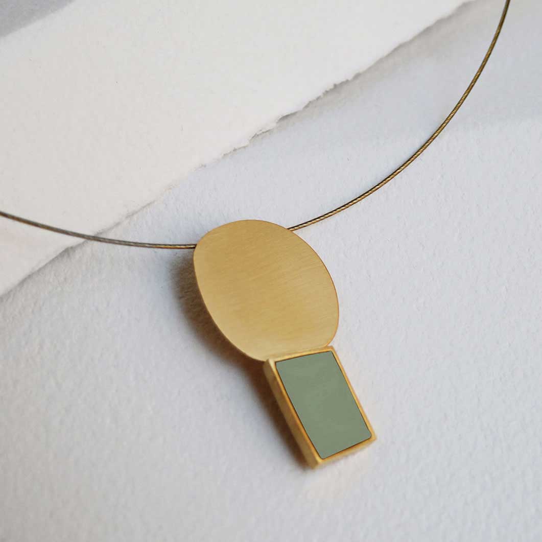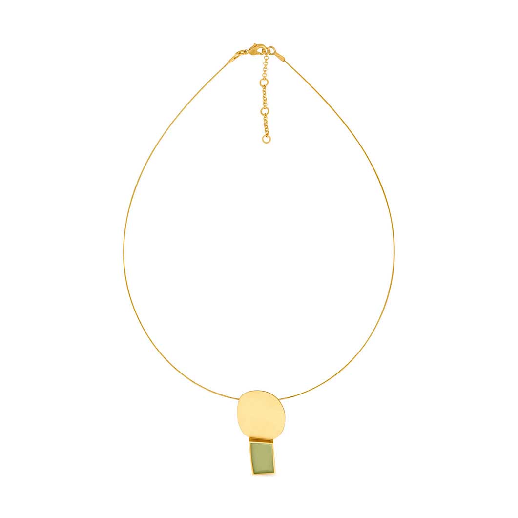 アーティストでありグラフィックデザイナーでもある、クリエイティブディレクターのCristina JuliàがGeometric Collageシリーズを考案しました。小さなネックレスには、24金メッキのマットな金属ドットとセージグリーンのエナメル長方形があしらわれており、普段の装いにモダンでミニマルなひねりを加えたいときに最適です。